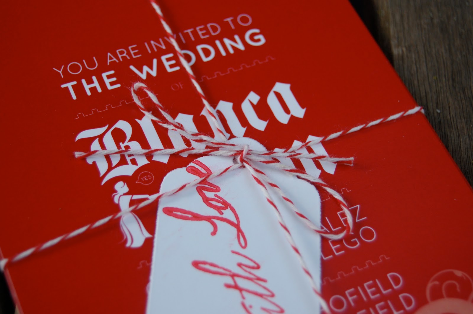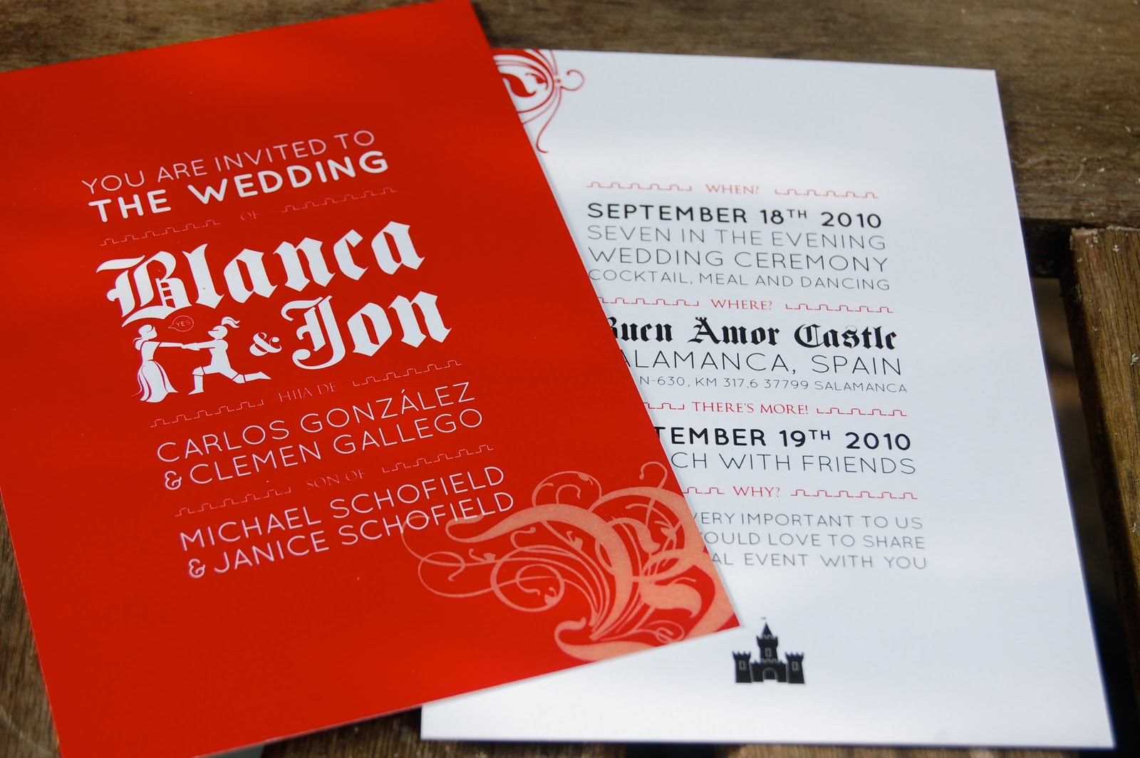 We started with the colour red and the idea to reflect the wedding venue. As we're getting married in a beautiful old castle we used the medieval theme throughout the invitations, with the stamp on the envelopes or the icon of a knight proposing to his lady (probably not very historically accurate, I know!). We also wanted the invitations to be fun and hopefully reflect that we want our day to be relaxed and not too formal.